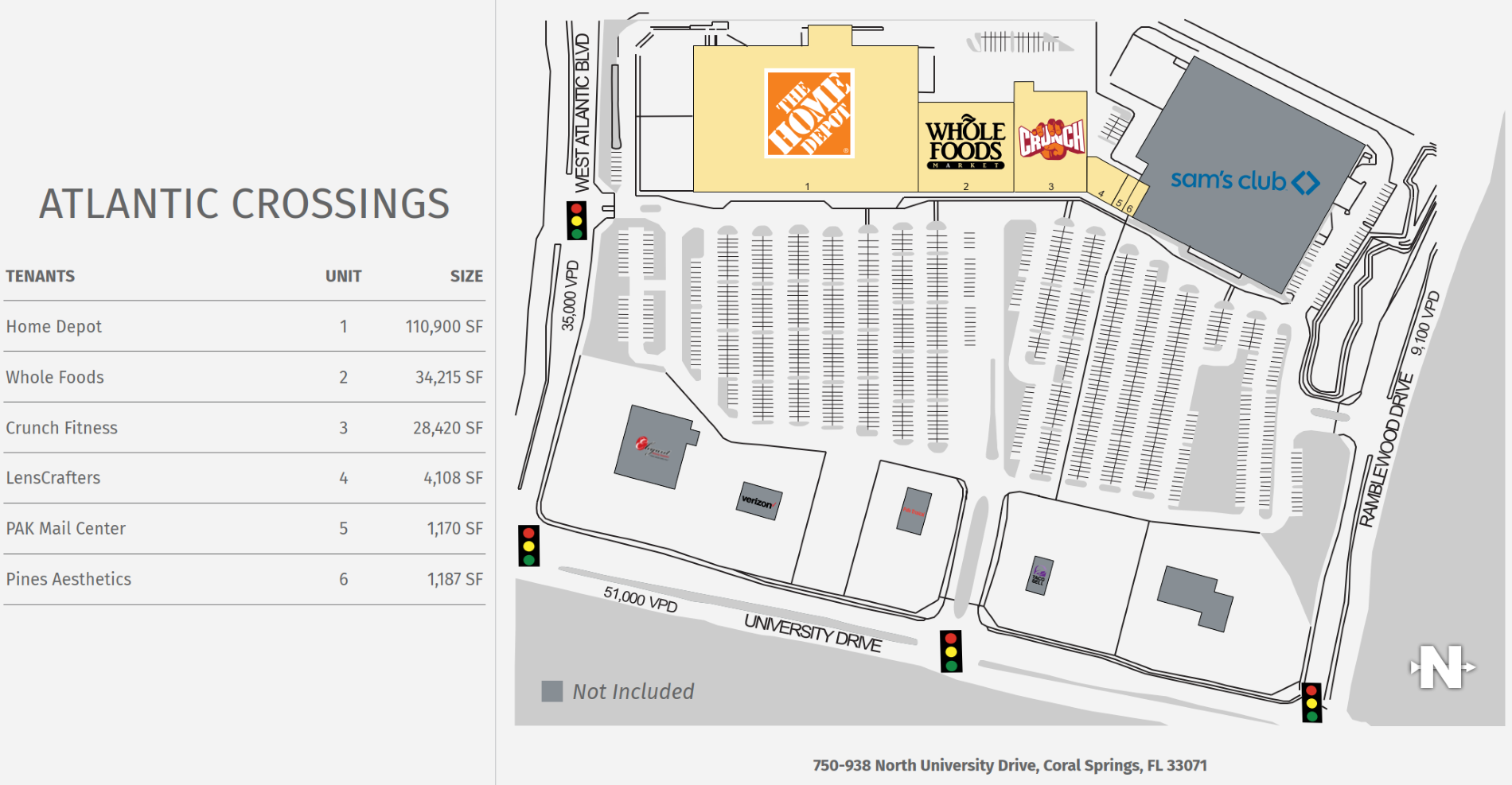 Atlantic Crossings is a ±173,680 square-foot retail center located on the area’s main thoroughfare — University Drive — at the prime intersection of University Drive and Atlantic Boulevard. The center is ideally situated in the heart of the Coral Springs commercial corridor across from the Coral Square Mall. Atlantic Crossing’s anchor tenants — Whole Foods, Home Depot and Sam’s Club — draw a large customer base from an expansive trade area. The surrounding community is densely populated with strong household incomes, making this area one of Broward County’s most desirable markets.
