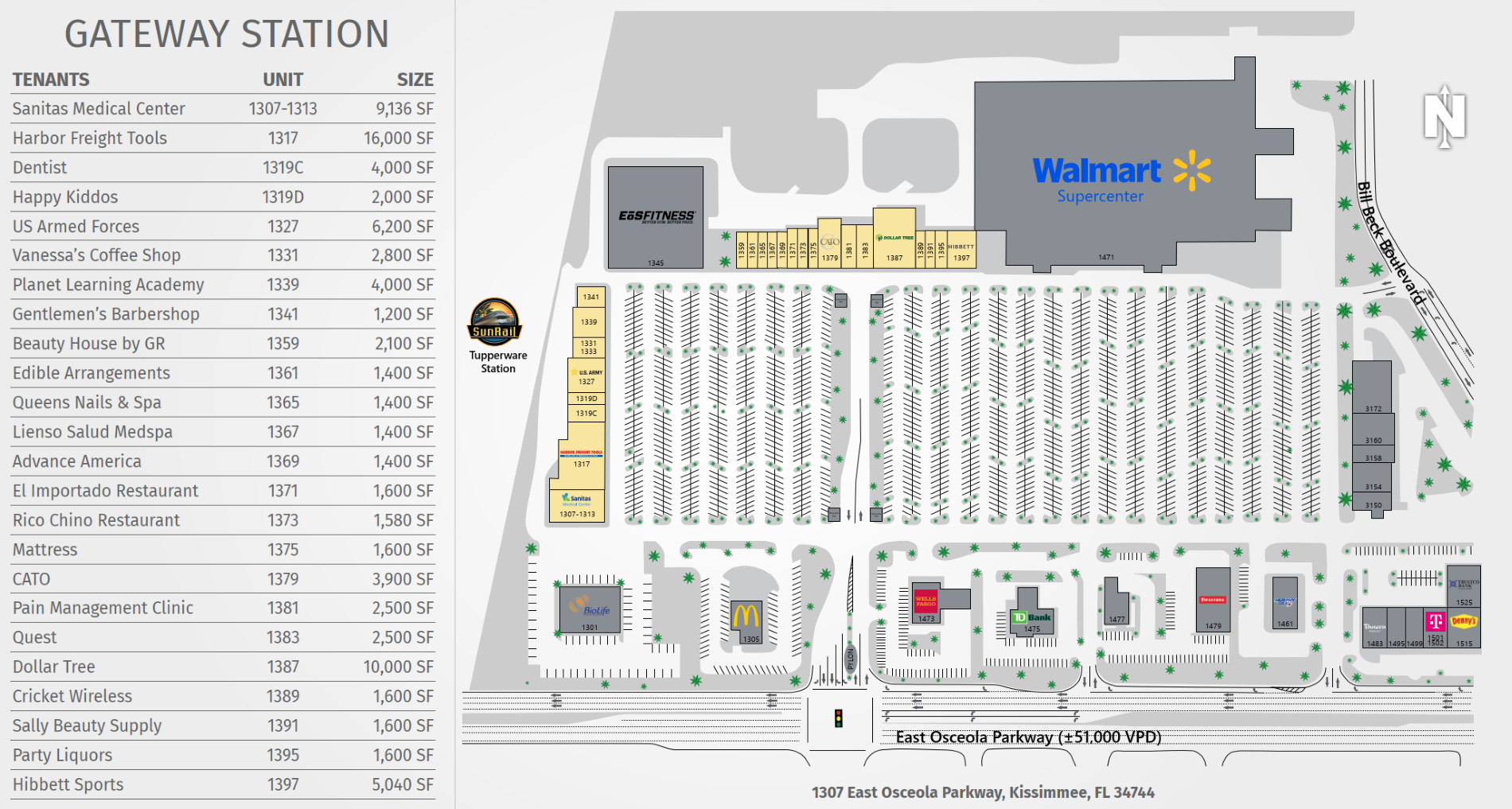 Gateway Station is located on Osceola Parkway (51,000 VPD) and Michigan Ave (32,500 VPD) at a bustling signalized intersection near Florida’s Turnpike. The center is shadow anchored by a dominant Walmart Supercenter (2.1 million visitors per year) and a brand new EOS Fitness. Co-tenants include Hibbett Sports, Harbor Freight Tools, Sanitas Healthcare, Dollar Tree, CATO Fashions, Vanessa’s Coffee Shop, and many other successful national and local tenants. Over 1,000 multifamily units are under construction or recently completed within a one-mile radius including 19 South, Parkway Crossings, and San Mateo Crossing. Dense population and being situation on one of the busiest roads in Central Florida make this a regional shopping destination, with many co-tenants seeing above average sales.