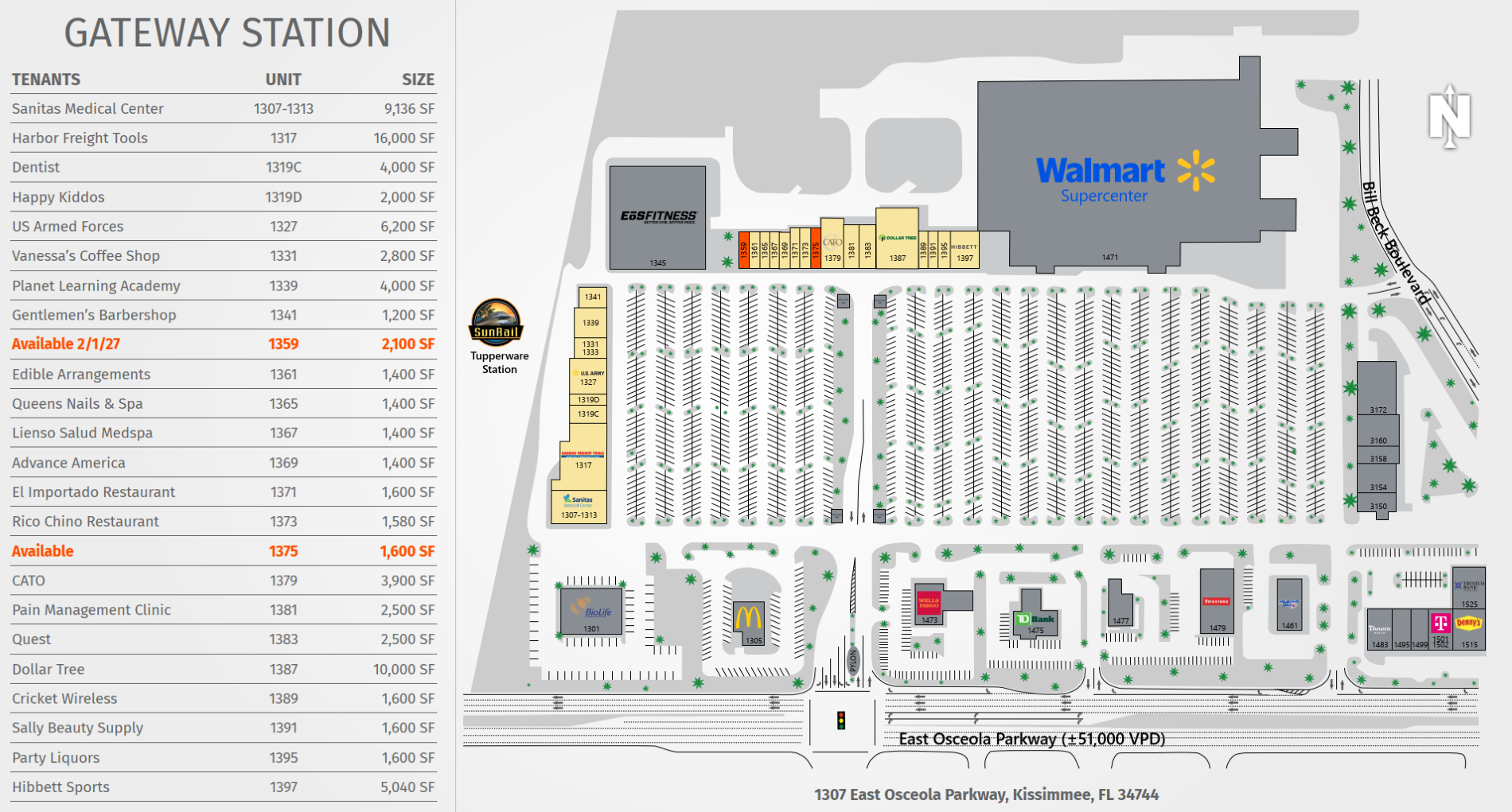 Gateway Station is located on Osceola Parkway (51,000 VPD) and Michigan Ave (32,500 VPD) at a bustling signalized intersection near Florida’s Turnpike. The center is shadow anchored by a dominant Walmart Supercenter (2.1 million visitors per year) and a brand new EOS Fitness. Co-tenants include Hibbett Sports, Harbor Freight Tools, Sanitas Healthcare, Dollar Tree, CATO Fashions, Vanessa’s Coffee Shop, and many other successful national and local tenants. Over 1,000 multifamily units are under construction or recently completed within a one-mile radius including 19 South, Parkway Crossings, and San Mateo Crossing. Dense population and being situation on one of the busiest roads in Central Florida make this a regional shopping destination, with many co-tenants seeing above average sales.