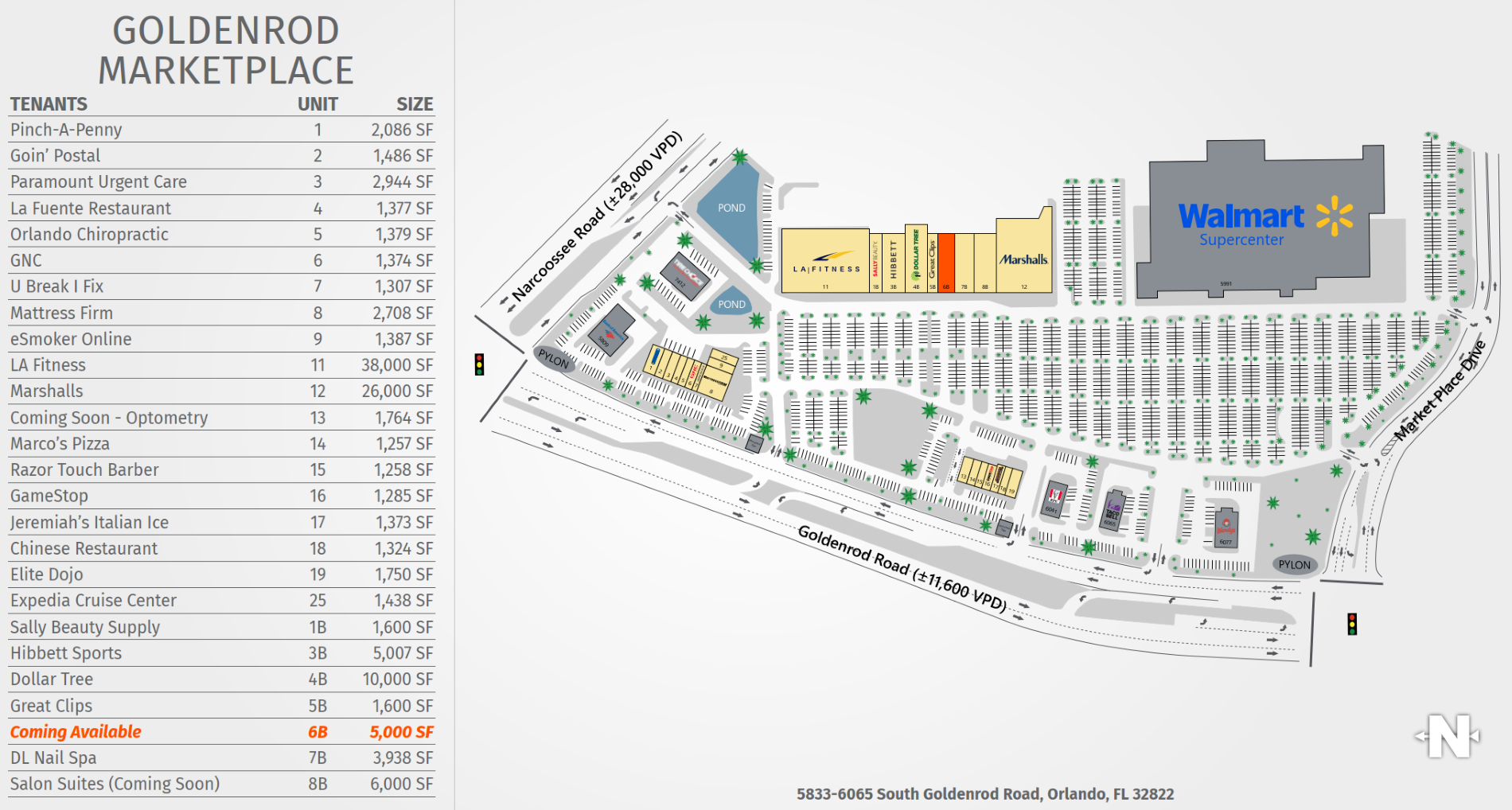 Goldenrod Marketplace is located at the busy signalized intersection of Narcoossee Road (26,000 VPD) and Goldenrod Road (12,500 VPD) with multiple (signalized) full access points into the shopping center. The center is shadow anchored by the second-most visited Walmart Supercenter in Central Florida and co-anchored by the second-most visited Marshalls in the entire state. Other co-tenants include LA Fitness, Hibbett Sports, Dollar Tree, Sally Beauty, Great Clips, Taco Bell, Wendy’s, KFC, Jeremiah’s Italian Ice, and many other strong national and local brands. Goldenrod Marketplace is adjacent to the brand new Vista Pointe Elementary School with over 500+ student enrollment. Dense multifamily, office, and industrial daytime population make this a busy center at all hours of the day and a regional shopping draw for an underserved population in southeast Orlando.
