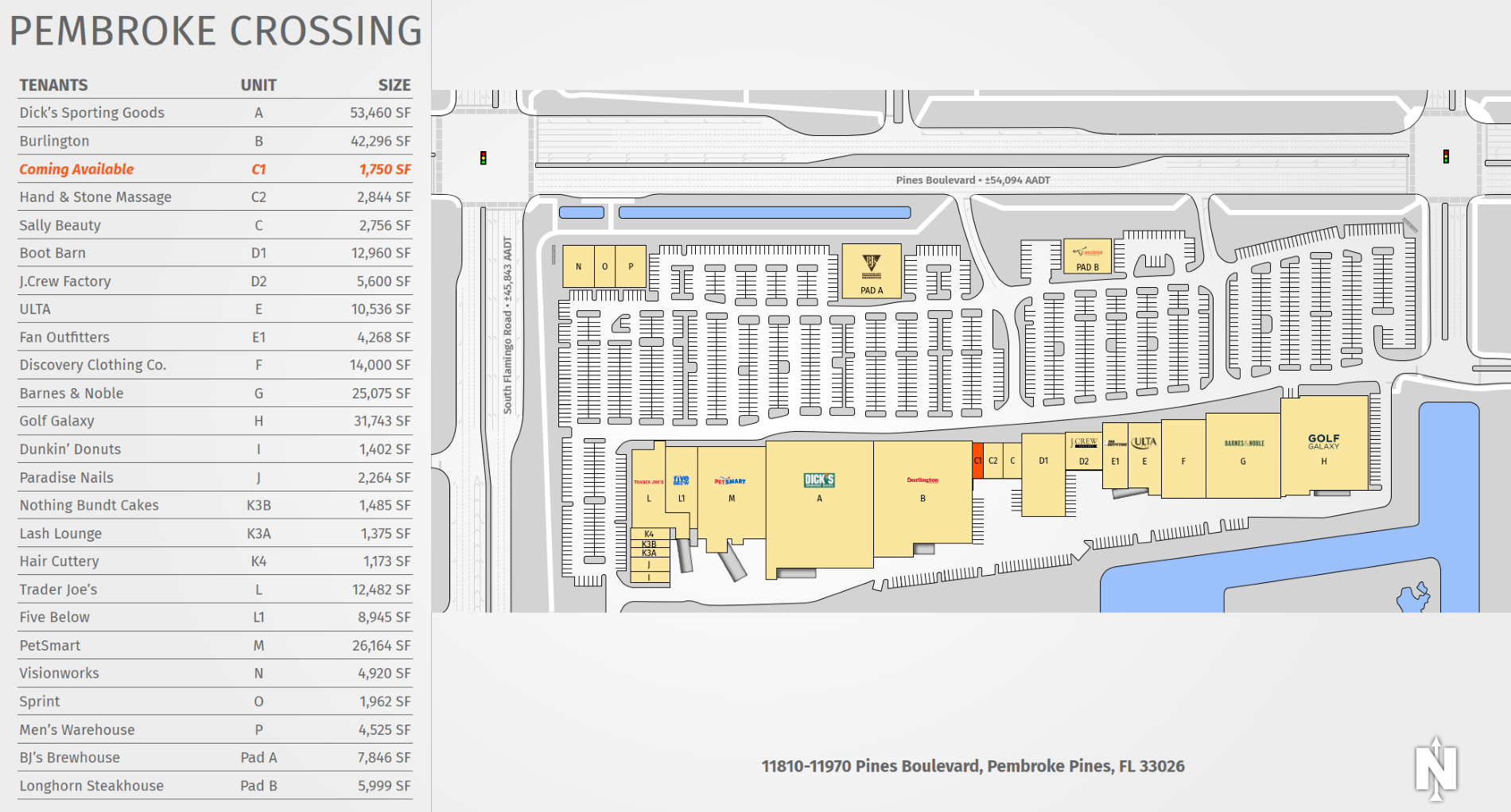 Pembroke Crossing is a ±288,993-square-foot power center featuring such notable tenants such as Trader Joe’s, Dick’s Sporting Goods, PetSmart, Golf Galaxy, and Barnes & Noble. The center is located at the heavily-trafficked intersection of Pines Boulevard and South Flamingo Road in Pembroke Pines, one of the fastest-growing communities in South Florida. Tenants at Pembroke Crossing benefit from its immediate proximity to Pembroke Lakes Mall, a strong daytime population, and the large residential population which sources the center with customers throughout the day.