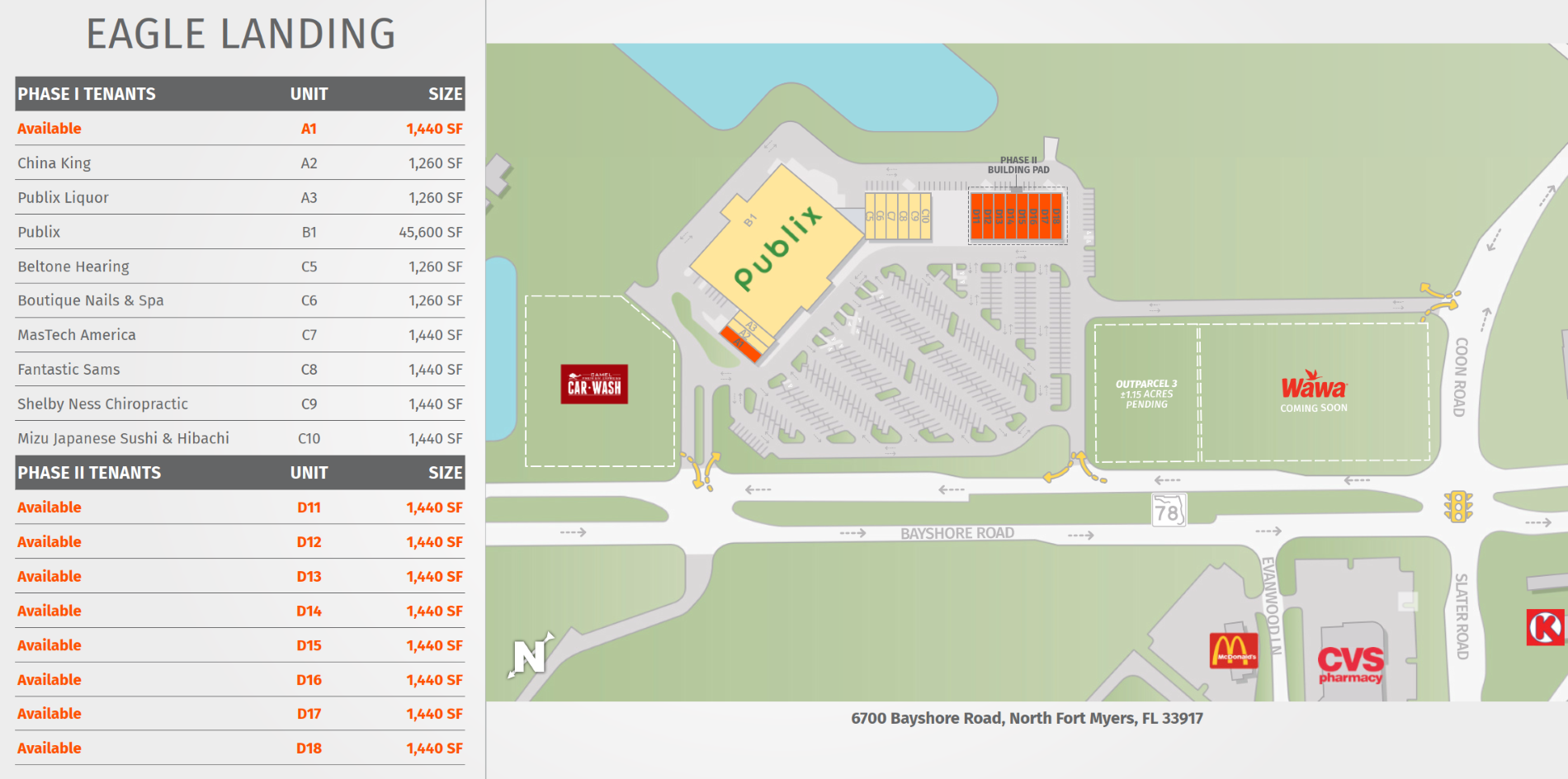 Located just three miles west of Interstate 75 on Bayshore Road at Coon Road, this center is perfectly positioned in the rapidly growing North Fort Myers submarket. With ±2,500 residences currently under construction and an additional ±1,750 residences planned within the three-mile radius, The Eagle Landing Shopping Center, with its ample parking and multiple access points, is set to become the retail hub of this flourishing area.