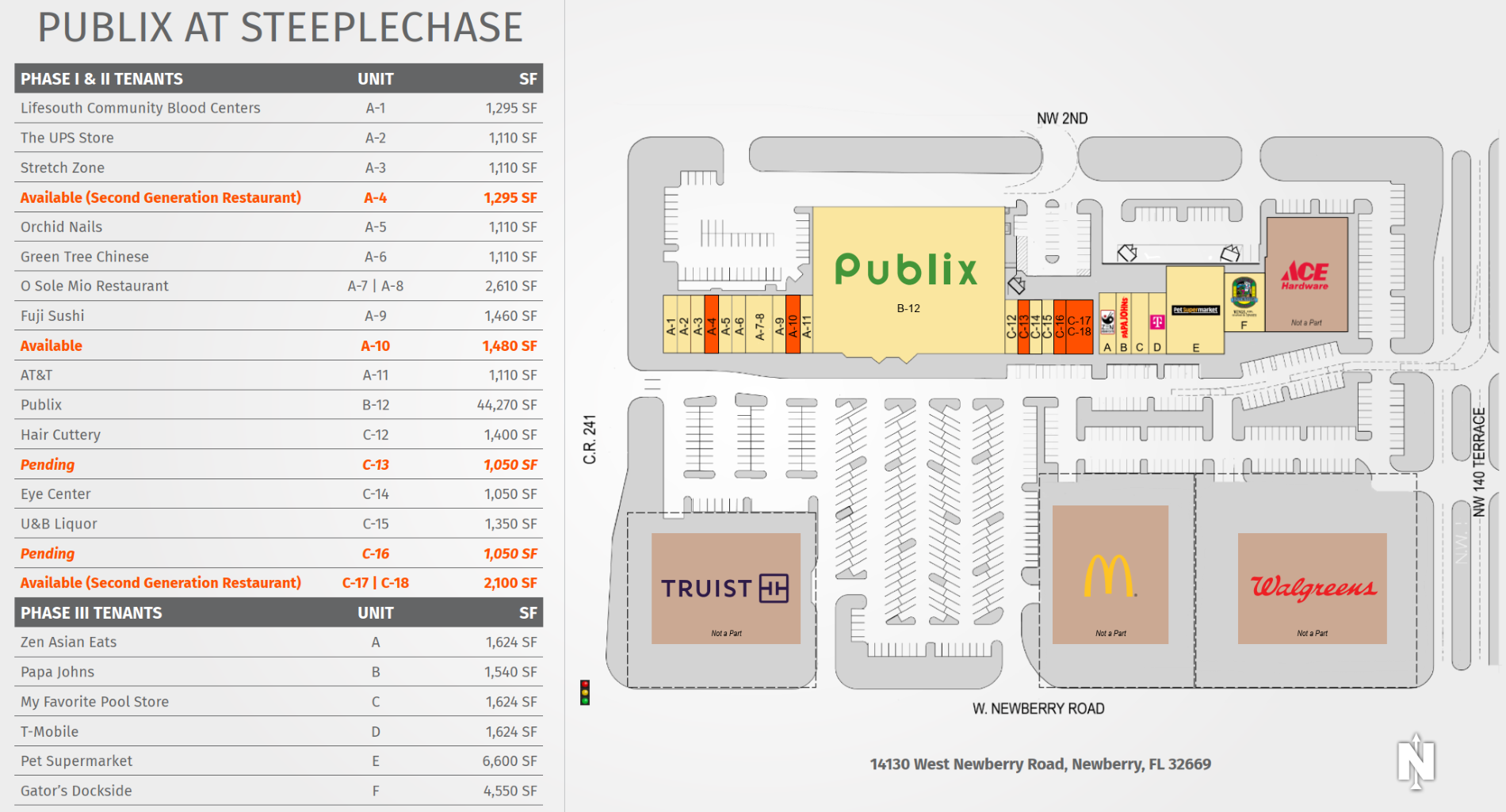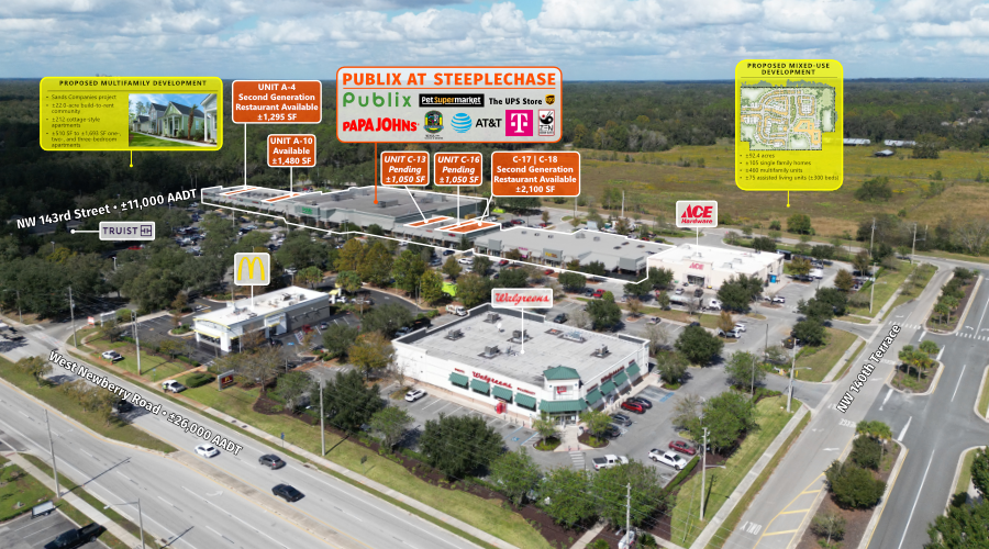 This center is located at West Newberry Road and County Road 241. Tenants at the center benefit from the affluent surrounding communities of Newberry and Jonesville along with minimal market competition. The immediate trade are exhibits strong demographics, with an average household income of $210,284, and a 2.7% annual population growth rate (2010 to 2023). Publix at Steeplechase is home to the top performing Publix grocery store in the greater Gainesville, FL area and among the highest in sales volume statewide