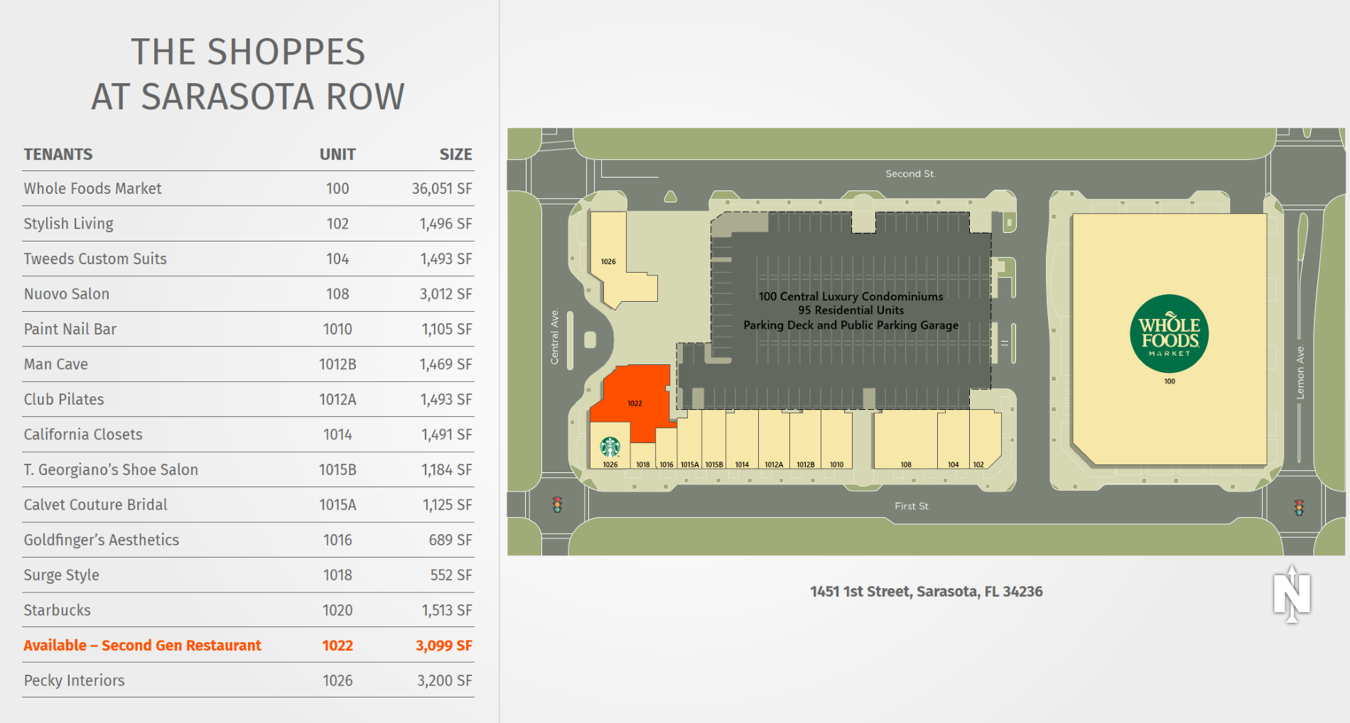 The Shoppes at Sarasota Row is an exceptional mixed-use complex nestled in the fast-growing downtown Sarasota, Florida market. The retail space sits on the ground floor of an 11-story, 95-unit residential tower, providing ample daily patronage. The property is located just a stone’s throw from the vibrant Sarasota Farmer’s Market (est. 1979) and 35 miles of world-class beaches. Tenants at The Shoppes at Sarasota Row benefit from significant foot traffic driven by Whole Foods, one of the few grocers located in the densely populated Sarasota CBD.