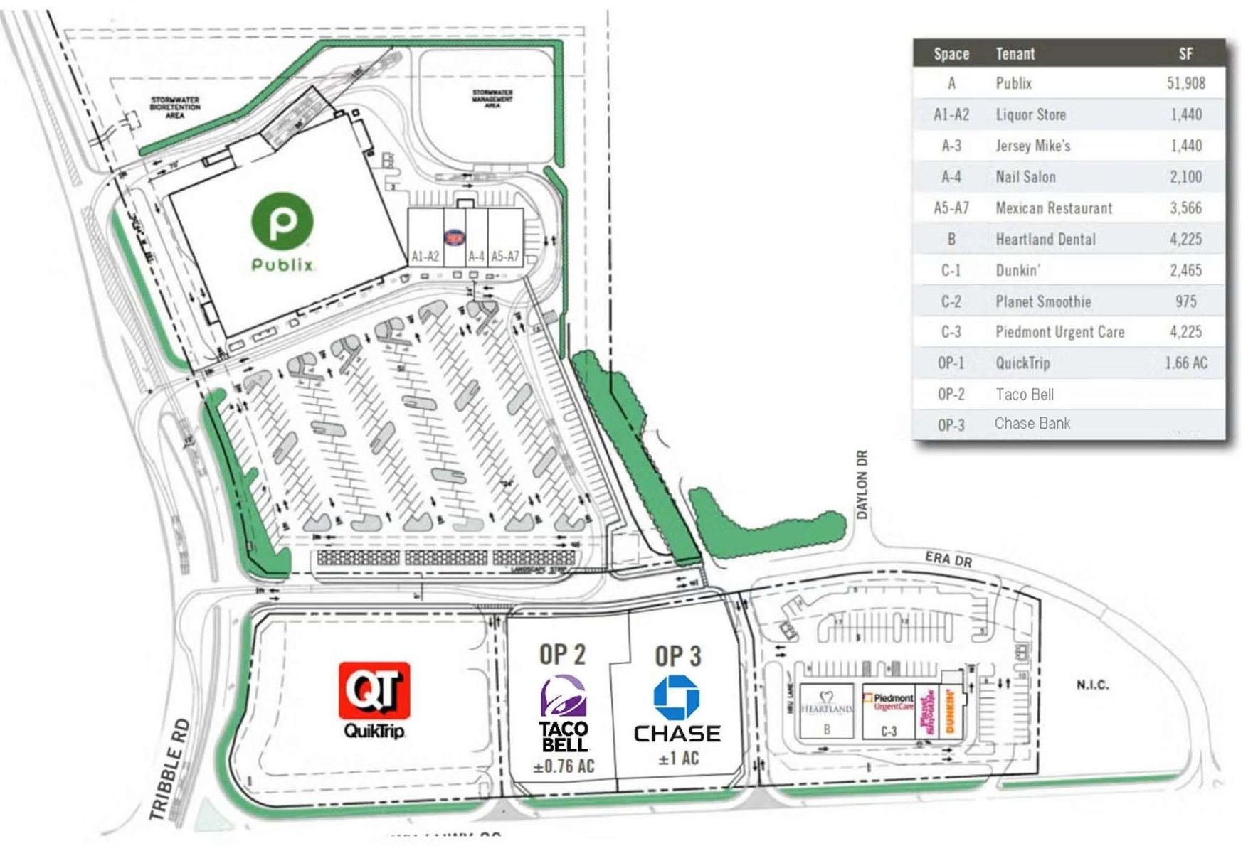 Tribble Crossing is a new Publix-anchored shopping center featuring a total of 70,077 square feet of retail space. The center is located at the northeast signalized intersection of Canton Highway (Georgia State Route 20) and Tribble Road. Tribble Crossing is located six miles northwest of downtown Cumming with multiple arterials connecting shoppers to Georgia State Route 400. The center is situated in an affluent, suburban market with average household incomes exceeding $168,000 within three miles.